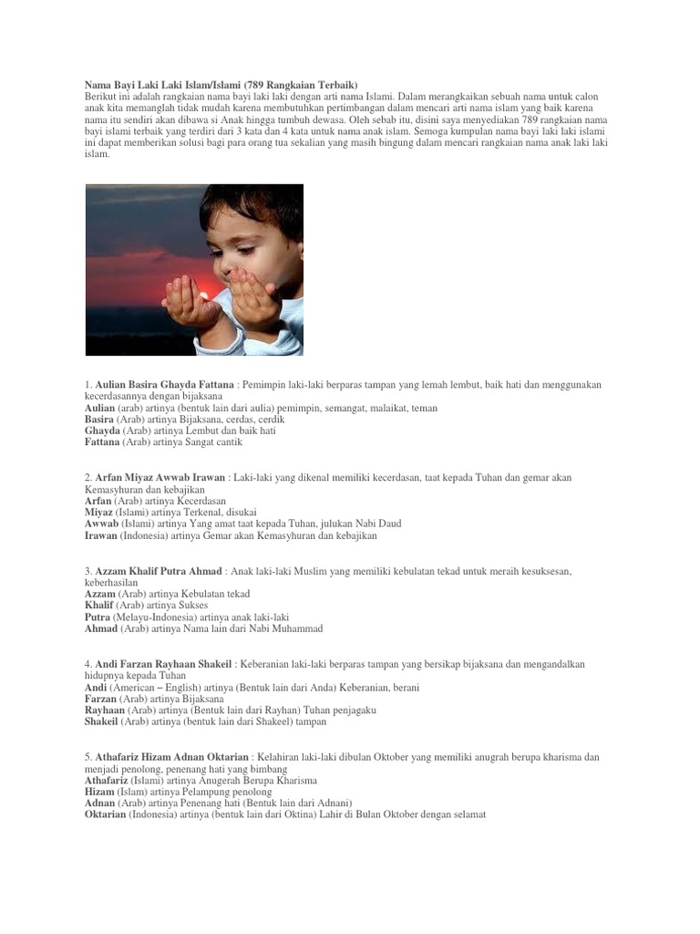 Nama anak laki laki islami yang saya pilihkan disini, semuanya mempunyai arti yang bagus yg tentunya sangat baik untuk penamaan calon anak laki 1. Dilengkapi arti, doa dan harapan yang indah bagi masa depan sang putra buah hati tercinta. Nama bayi yang anda gunakan untuk anak anda, harus bermakna baik agar menjadi doa dan harapan orang tuanya di kemudian hari. Atau malah semakin bingung karena banyak nama yang sayang dibuang? Jika anda masih belm menemukan nama yang tepat dari nama nama modern, anda bisa menggunakan jadi, tidak heran ada banyak orang yang ingin memberikan nama bayi laki laki islami yang baik untuk buah hatinya karena memang nama adalah. Dalam agama islam hukum memberikan nama yang baik adalah wajib. Apapun pilihan anda, pastikan hak buah hati untuk mendapatkan nama yang baik. Adzriel rafiq syahputra, yang mempunyai arti :